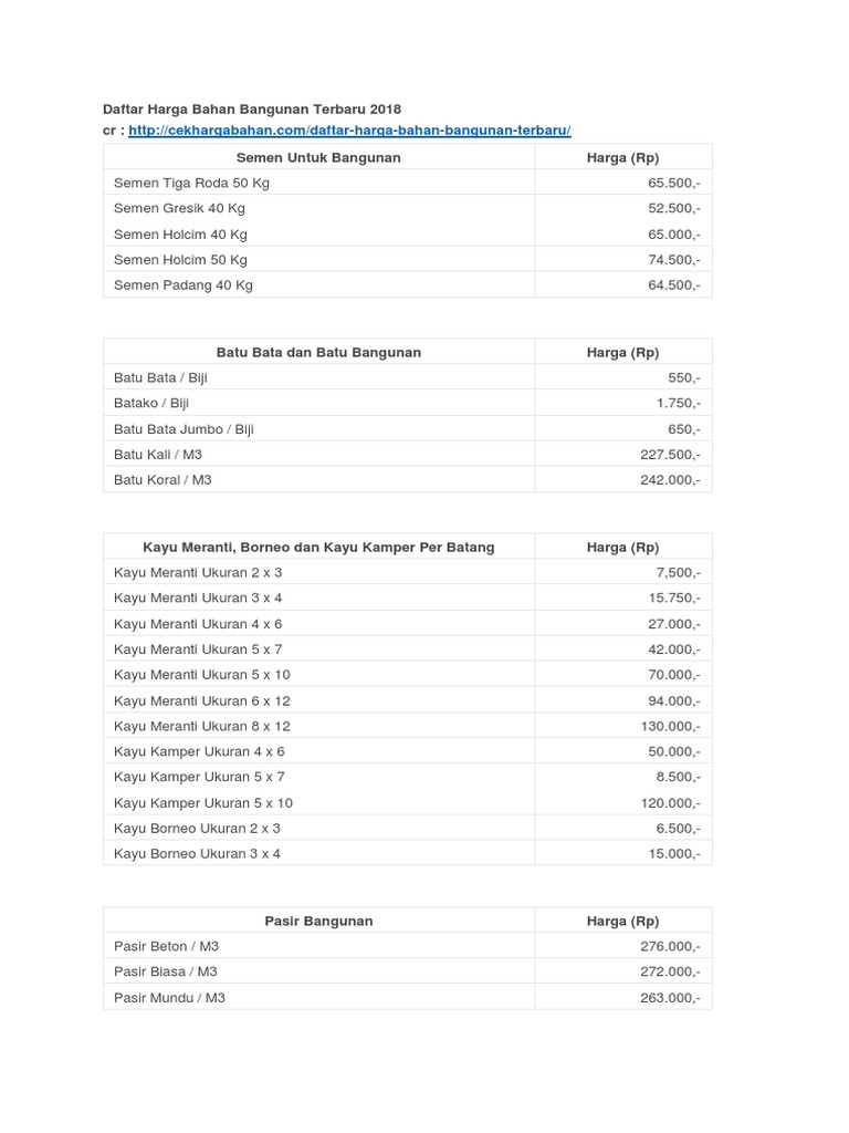 Daftar harga bahan bangunan/ material terbaru januari january 3, 2021 december 3, 2020 by rezzaid j ika kamu berniat untuk membuat rumah baru atau sedang ingin merenovasi rumah, maka informasi yang pasti akan kamu butuhkan adalah mengenai harga bahan bangunan terbaru yang ada di pasaran. Daftar harga bahan bangunan semen tiga roda dan holcim. Untuk lantai, dinding, ruangan, plafon, sampai dengan bahan dasar furniture. Anda harus melakukan pengecekan harga pasir di sekitar anda atau di toko bahan bangunan terdekat untuk memastikan. Harga semen terbaru 2015 ### harga semen daftar harga semen 2015 :
